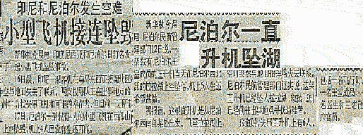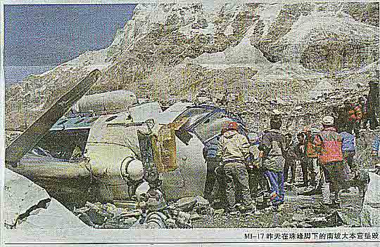 2003年5月29日尼泊尔为庆贺人类首次登上珠峰50周年纪念,一架由加德满都飞往登山营地的MI-17型直升飞机在到达营地时因气候恶劣下降未能成功后又因机械故障而坠毁(下图为坠机现场) |