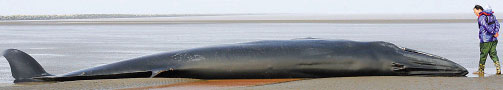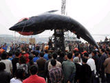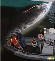 浙江渔民吊起10吨重巨型须鲸3月19日中午12时,浙江省舟山市定海区金塘岛沥港渔业码头,一条长12米左右,直径近1米,重在10吨以上的大鱼被渔民发现。专家在看过“大鱼”的照片后推断,这应该是一条须鲸。 |