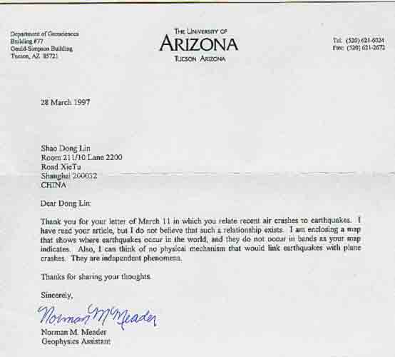 美国亚利桑那大学收到空难文稿后回信说不信此论点。但是去信预告美国加州、东京、厄瓜多尔地震就再也没有答复了。