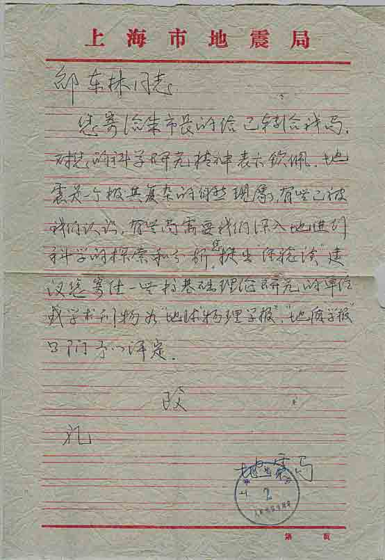 这是第一次向上海市长朱熔基预告上海地震的回信,该次地震前半年因上海虹桥机场飞机89年