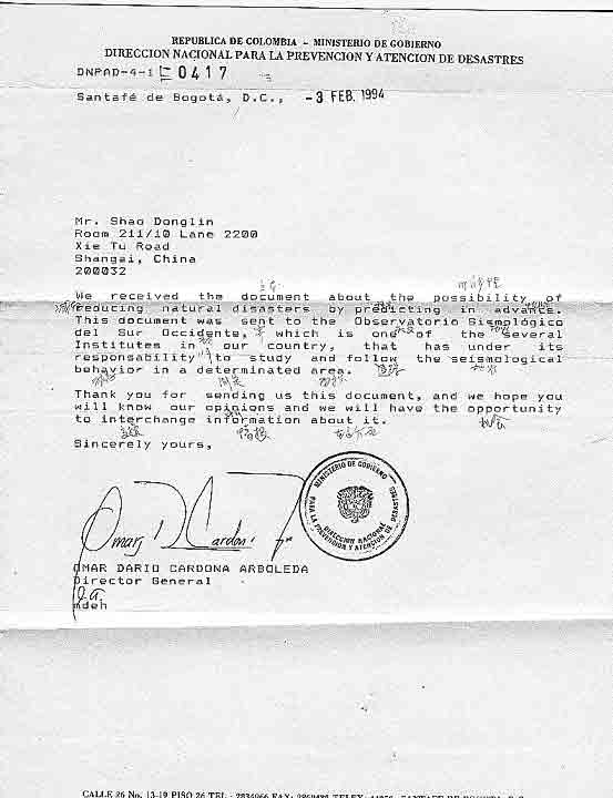 哥仑比亚总统府回信